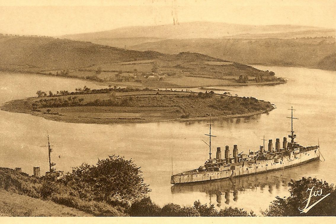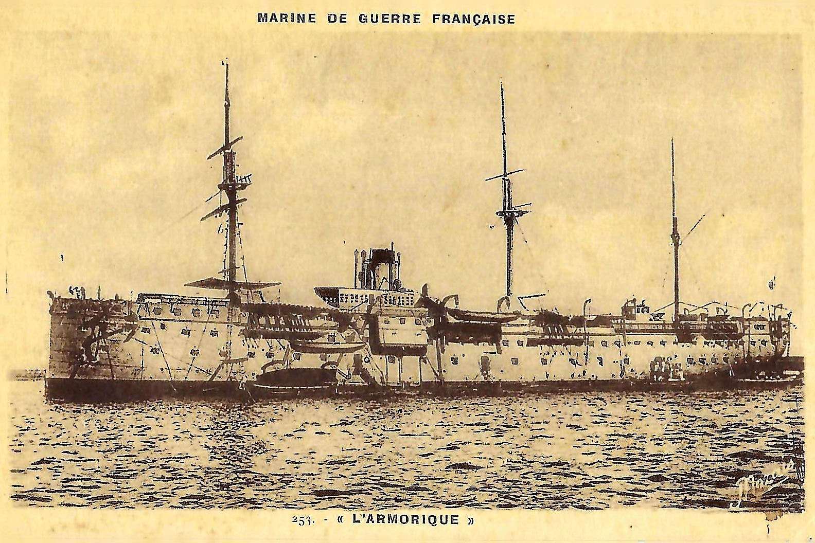 Lancé en 1879 à Cherbourg, baptisé Mytho, il a connu les rivages lointains de l'Orient, et spécialement ceux de l'Indochine. Pour devenir, revenu à Brest, le Bretagne. Et finalement, prendre en 1912 le nom d'Armorique comme navire école, à l'Ecole des mousses. Récupéré par l'occupant en 1940, le bateau est transformé en navire atelier, mouillé dans l'anse de Penform. À l'été 1944, la marine allemande, incendie et coule l'Armorique.