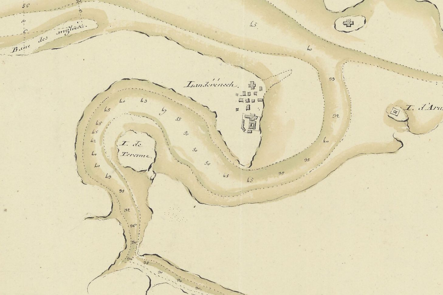 Relevés de profondeurs (en pied 0,33 m) de l'embouchure de l'Aulne - extrait de carte d'A. Groignard 1779 - source Gallica/BnF - lien
